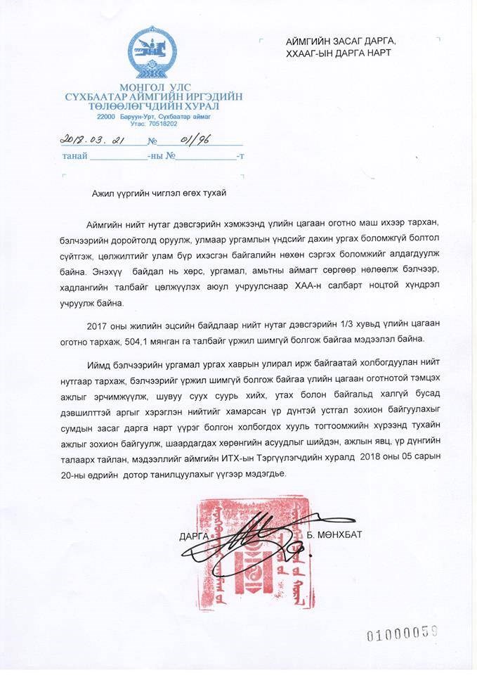 НИЙТ НУТАГ ДЭВСГЭРТ ҮЛИЙН ЦАГААН ОГОТНО ЭЛБЭГШИЖ БЭЛЧЭЭРИЙН ТАЛХЛАЛТ БИЙ БОЛСОНТОЙ ХОЛБОГДУУЛЖ ИТХ-ЫН ДАРГА СУМДЫН УДИРДЛАГУУДАД МЭДЭГДЭЛ ӨГЛӨӨ.