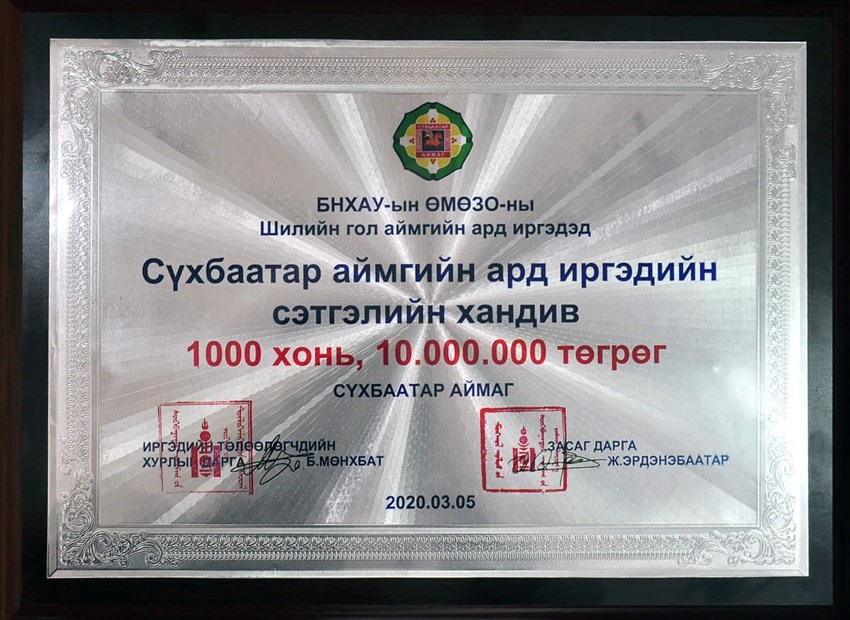 Сүхбаатар аймгийн ИТХ-аас ард иргэдийн зүгээс чин сэтгэлийн хандивын аян өрнүүлэхийг уриалан ажиллаж байгаа билээ. Энэхүү уриалгад нэгдсэн Сүхбаатар аймгийн ард иргэдийн сэтгэлийн хандив болсон 1000 цагаан хонь, 10 сая төгрөгийг Сүхбаатар аймгийн ИТХ-ын дарга Б. Мөнхбат, Засаг дарга Ж. Эрдэнэбаатар нар БНХАУ-ын ӨМӨЗО-ны Шилийн гол аймгийн иргэдэд хандивлахаар 2020 оны 03 сарын 05-ны өдөр баталгаажуулах гарын үсгээ зуржээ. Энэхүү ураилгад нэгдсэн албан байгууллага, хамт олонд талархаж байгаагаа илэрхийлье. Аян үргэлжилж байна...